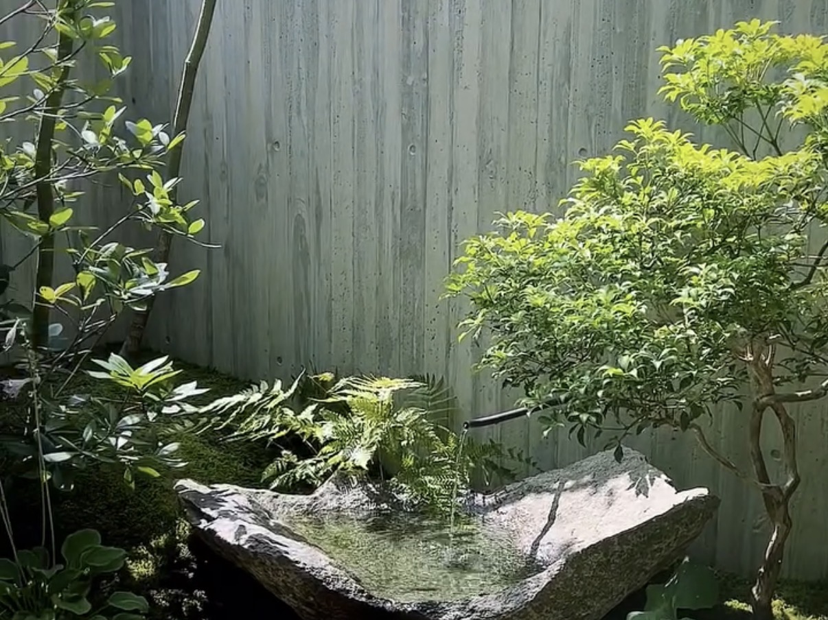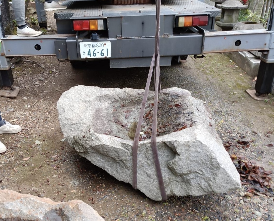 水盤には庵治石を据えます。