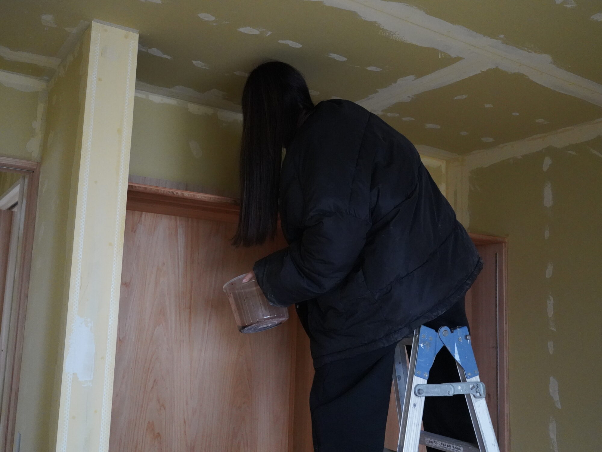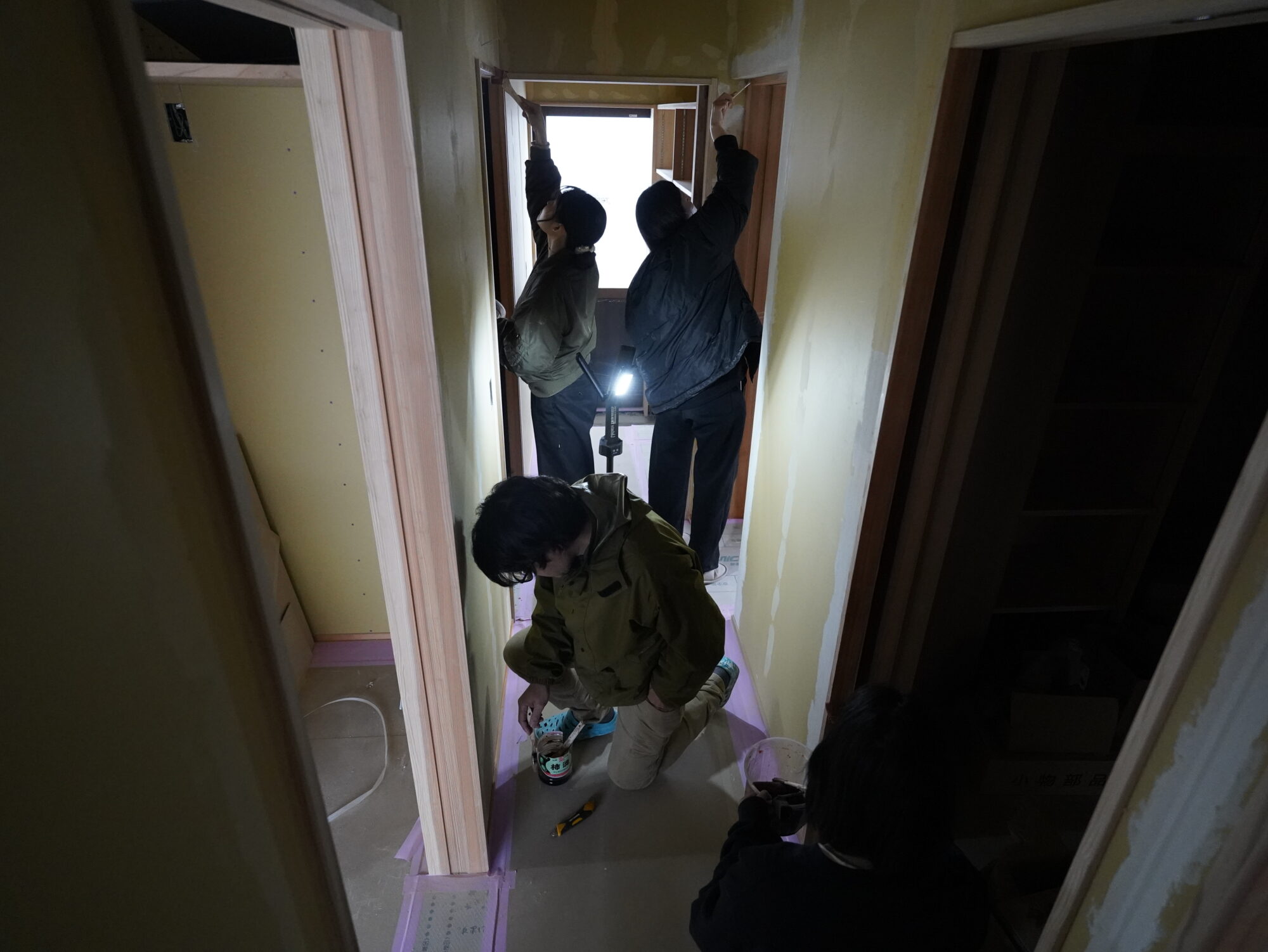 親子仲良く、そとん壁を塗るさま。。