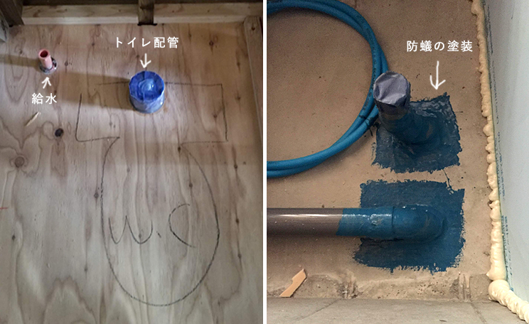 基礎コンクリートの貫通部分には、防蟻処理のために専用のシール(コーキングの様な隙間を埋める為のもの)と、蟻が嫌がる成分を含んだ塗装を施工します。