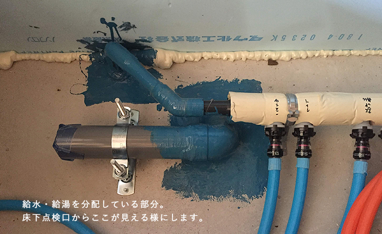 ②家の床には床下を点検できるように床下点検口を設けますが、配管の確認も床下点検口からできるようにする為に、配管ルートを確認しながら配管をしていきます。