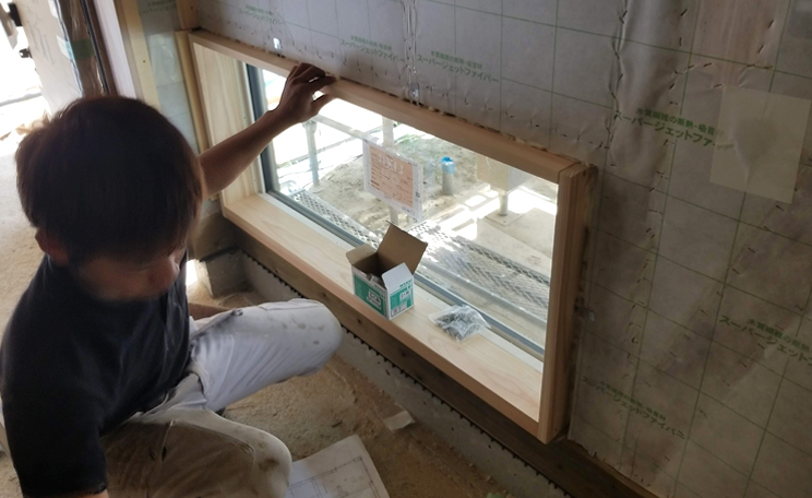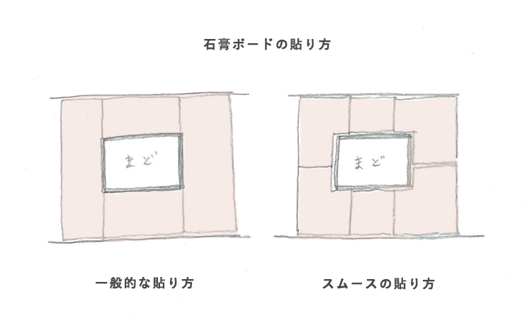 完成後も木造の家は収縮し動いています。窓の場合、窓枠のゆがみの動きに対してスムースでは下のように石膏ボードを貼っています。そうすることで、仕上がりのクロスや珪藻土にヒビが入りにくいのです。