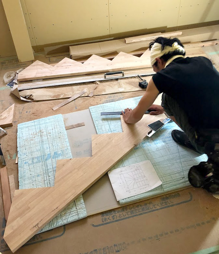 この工程はスムースの家らしい家具が出来るか重要な工程です。大工さんと綿密に打合せし、耐久性や使いやすさなどあらゆる方面で検討します。