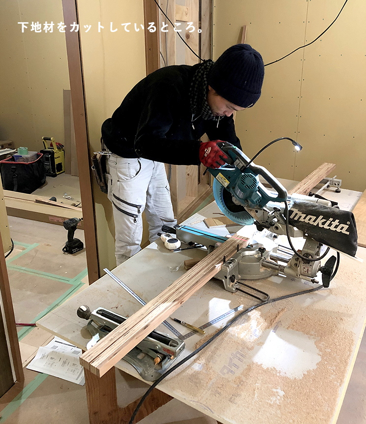 造作の収納棚、タオル掛け・鏡などのアクセサリーを設置する箇所には、補強のために下地材を取り付けます。どの場所に収納棚等を固定するのか展開図や施工詳細図を確認してもらいながら取り付けしてもらいます。