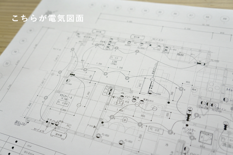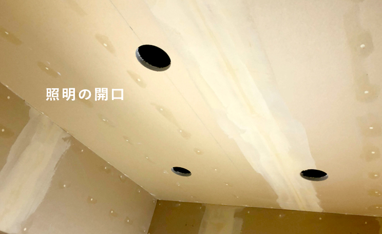 壁にクロスや珪藻土塗りで仕上げをする前に、照明器具・スイッチ・コンセントの位置に穴を空ける作業を行います。電気屋さんが、照明器具の種類(壁に埋め込むタイプなのか、引掛けシーリングなど後から設置するタイプなのか等)や台数、開口位置を照明プランにあわせて開口します。電気図面の位置に適正に開口が出来ているのか確認後、クロス貼りや珪藻土塗り等の次工程の段取りをしていきます。