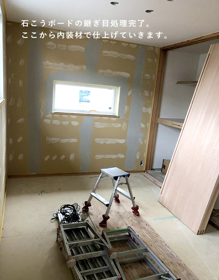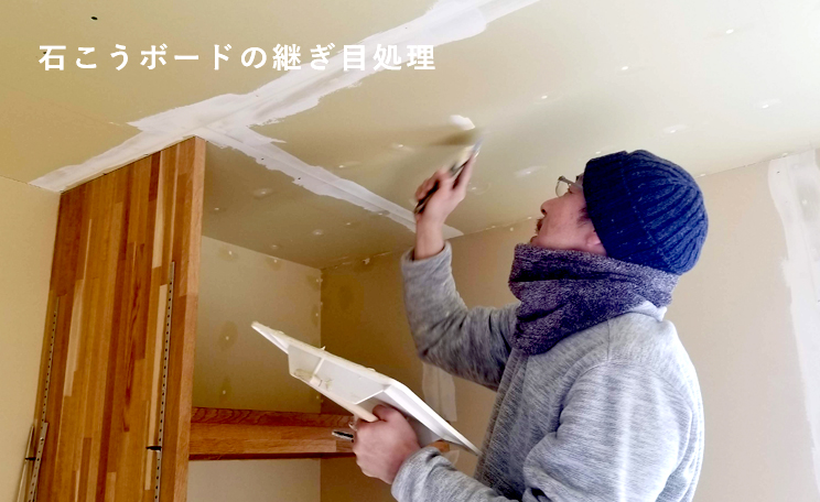 壁や天井の石こうボードの繋ぎ目を下地処理して内装材で仕上げます。