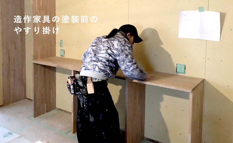 スムースでは無垢材の建具や家具をオリジナル造作しており、大工さんが造った建具・家具に塗装屋さんが塗装を行います。色を塗る前に木材にペーパーがけし、ほこりを取り除きます。