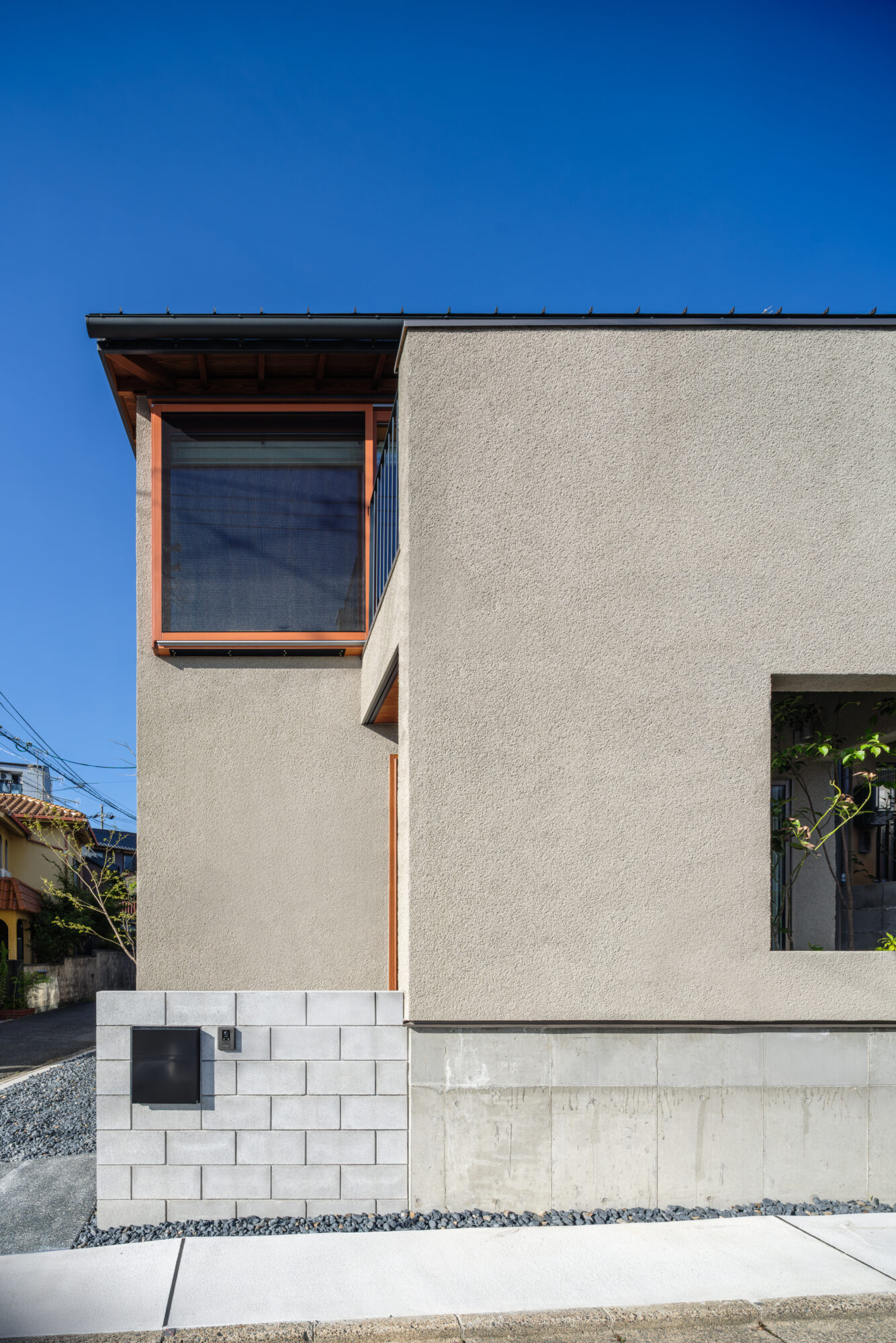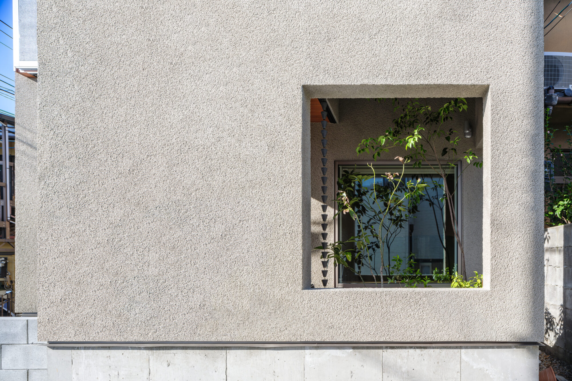 外観は色味や凹凸を抑えたそとん壁左官仕上げとし街並みに静かに溶け込む構成としました。道路側は開口を最小限に抑え、プライバシーを確保しながら、必要な採光と通風は内部構成によって確保しています。