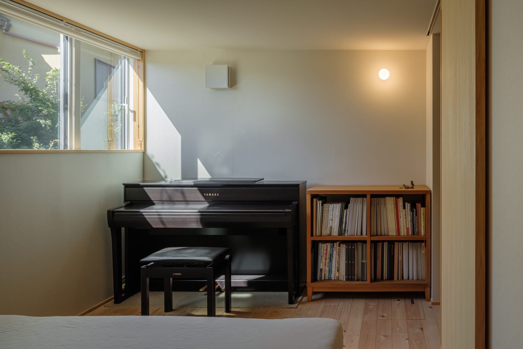 庭に向けた開口が視線と緑を取り込み、演奏と日常が静かにつながる居場所としています。