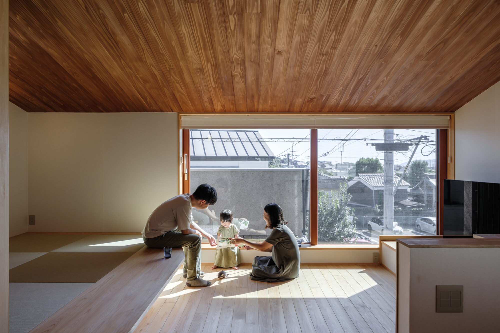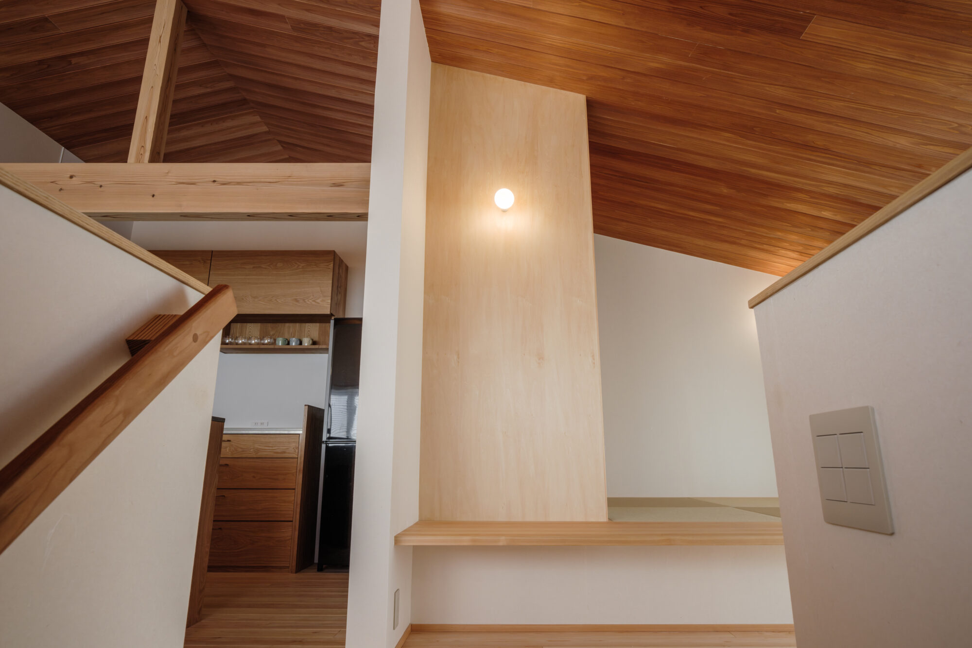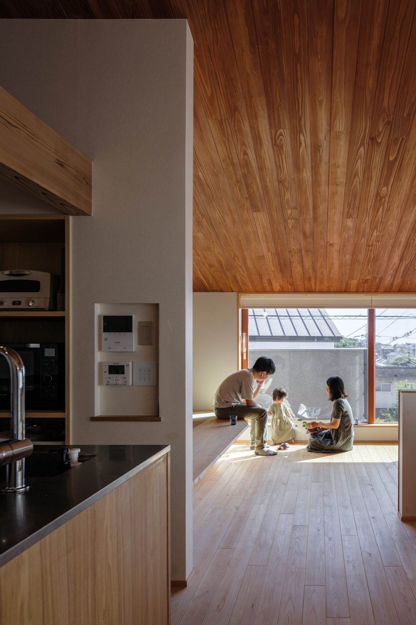 床や天井、造作家具に用いた木の質感が、暮らしの音や気配をやさしく受け止め、空間に穏やかなリズムを生み出します。畳の間は、段差によってゆるやかにつながり、それぞれの時間が重なり合う場になり、家族の居場所がここにあります。