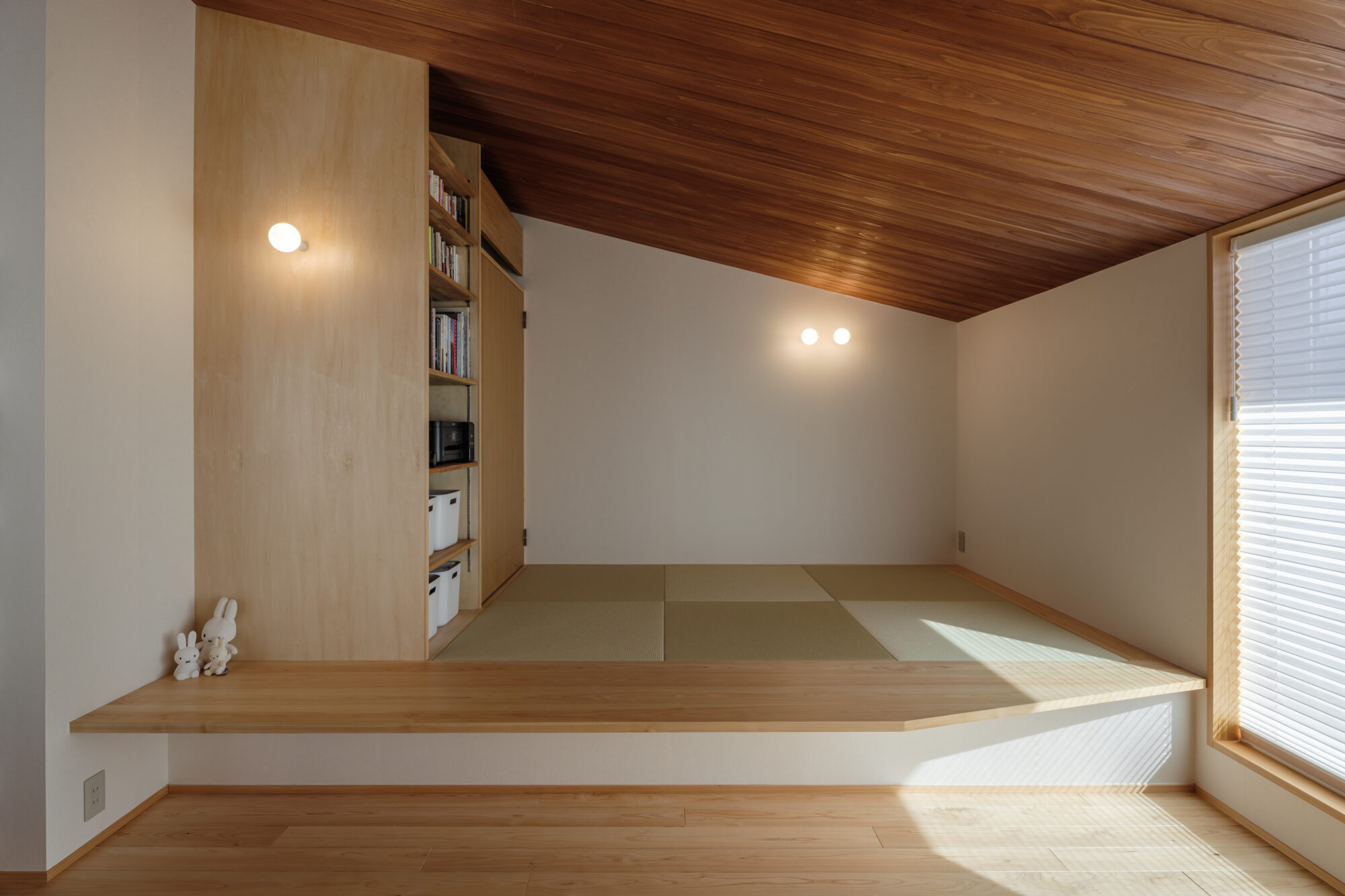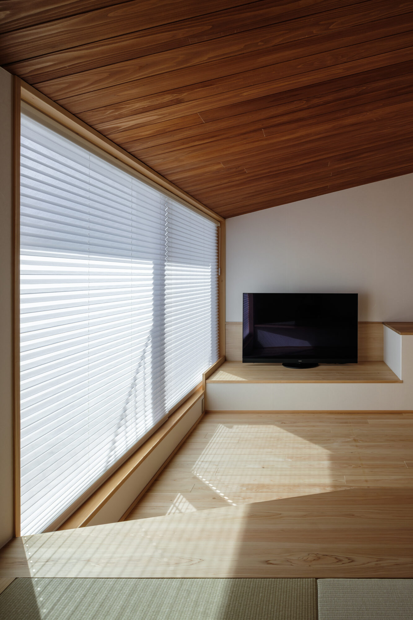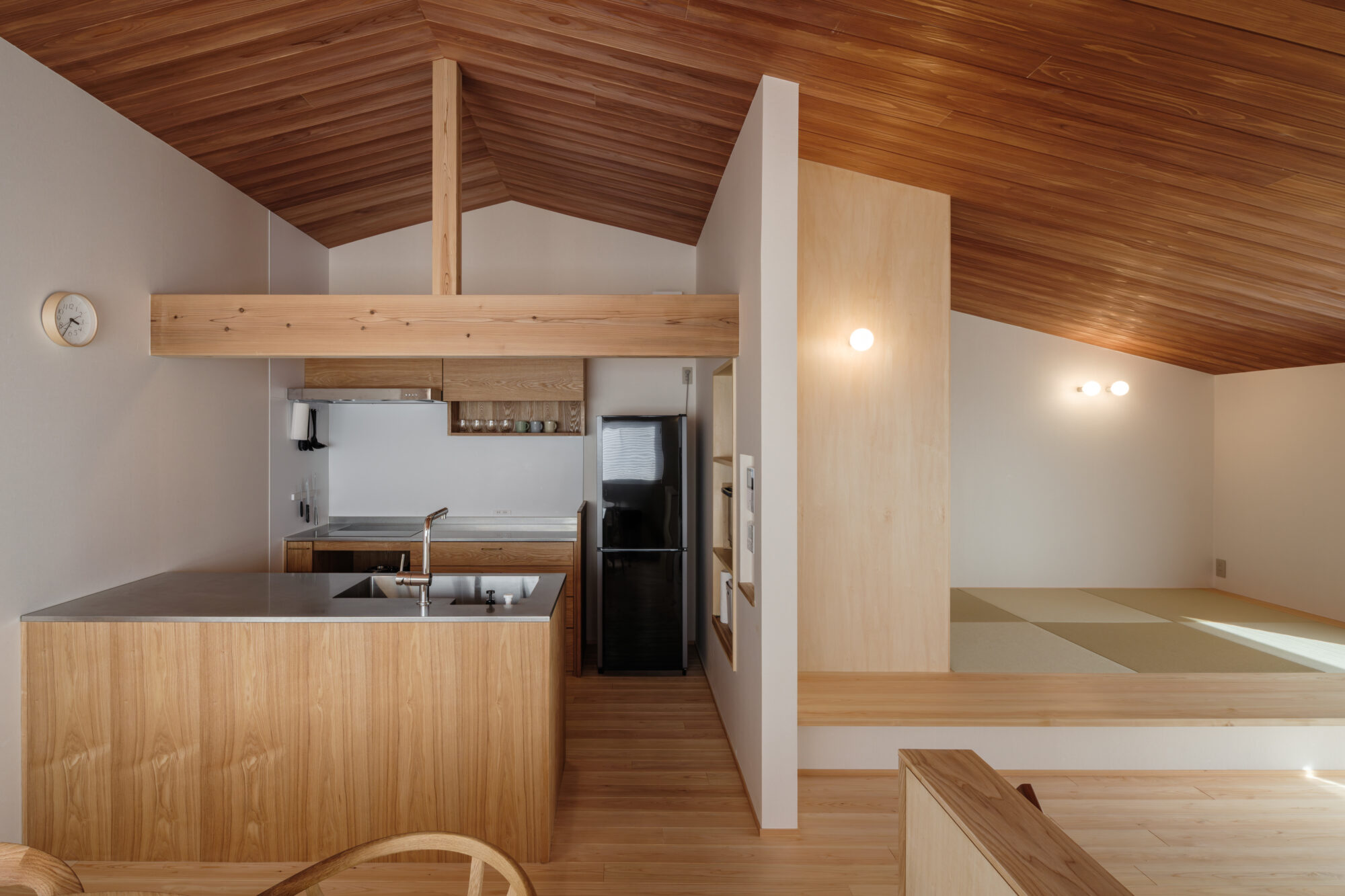 床や天井、造作家具に用いた木の質感が、暮らしの音や気配をやさしく受け止め、空間に穏やかなリズムを生み出します。畳の間は、段差によってゆるやかにつながり、それぞれの時間が重なり合う場になり、家族の居場所がここにあります。
