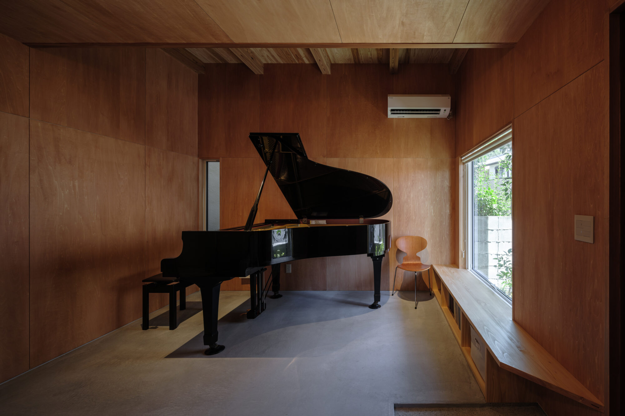 ピアノ演奏のための専用室は、コンクリート土間と柿渋仕上げの壁で音と空間の安定感を確保。