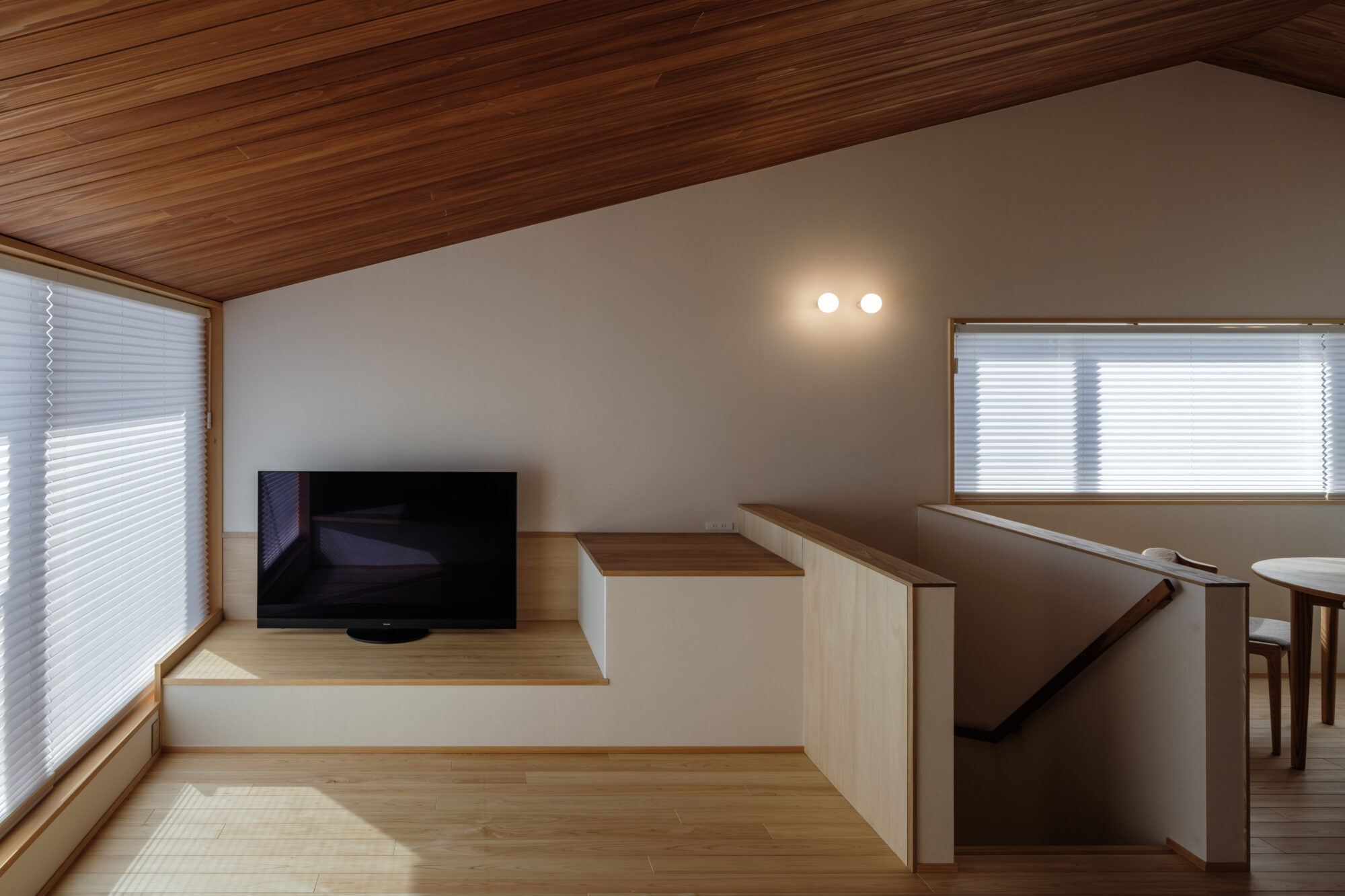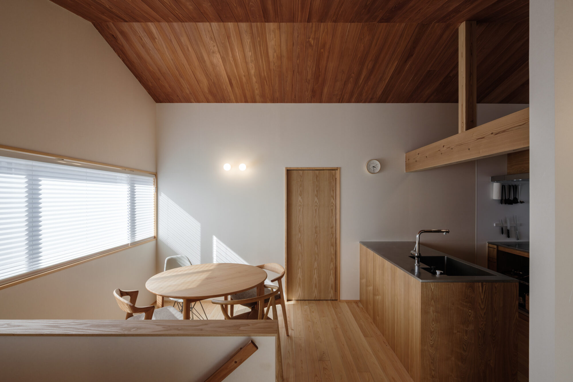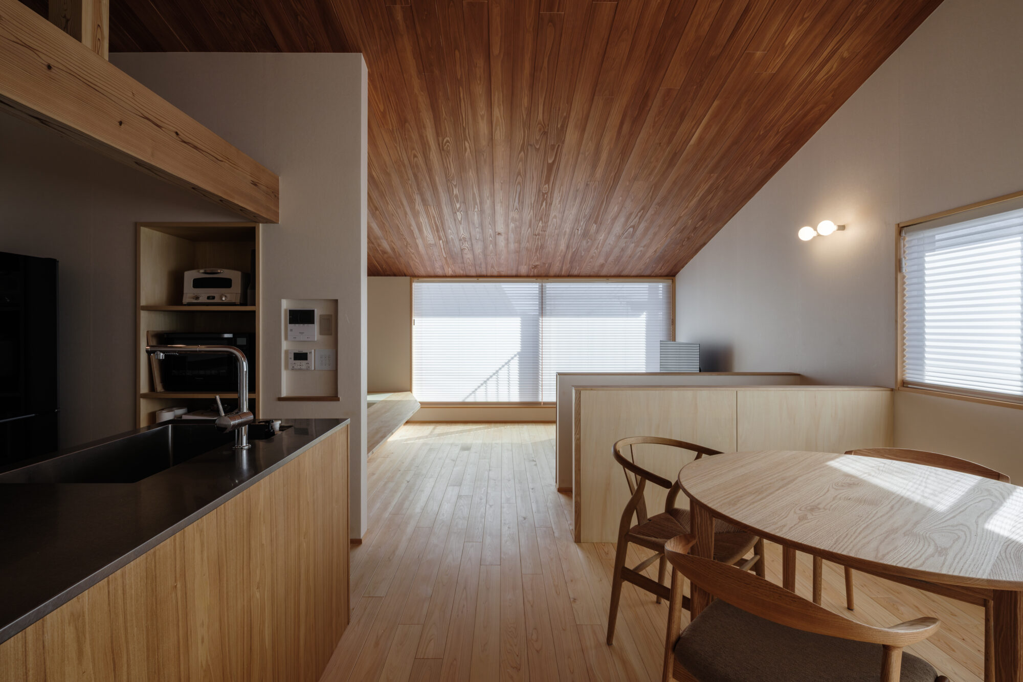 勾配天井の下、光は静かに天井をなぞり、木の色に溶け込みながら室内へと降りてきます。二階に設けたリビング・ダイニングは、視線と気持ちが自然にほどけるよう、伸びやかな高さと余白を大切にしました。
