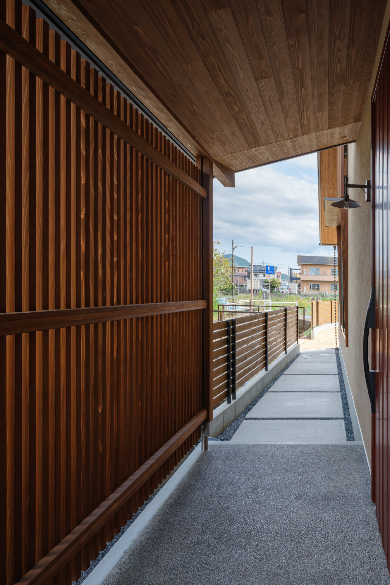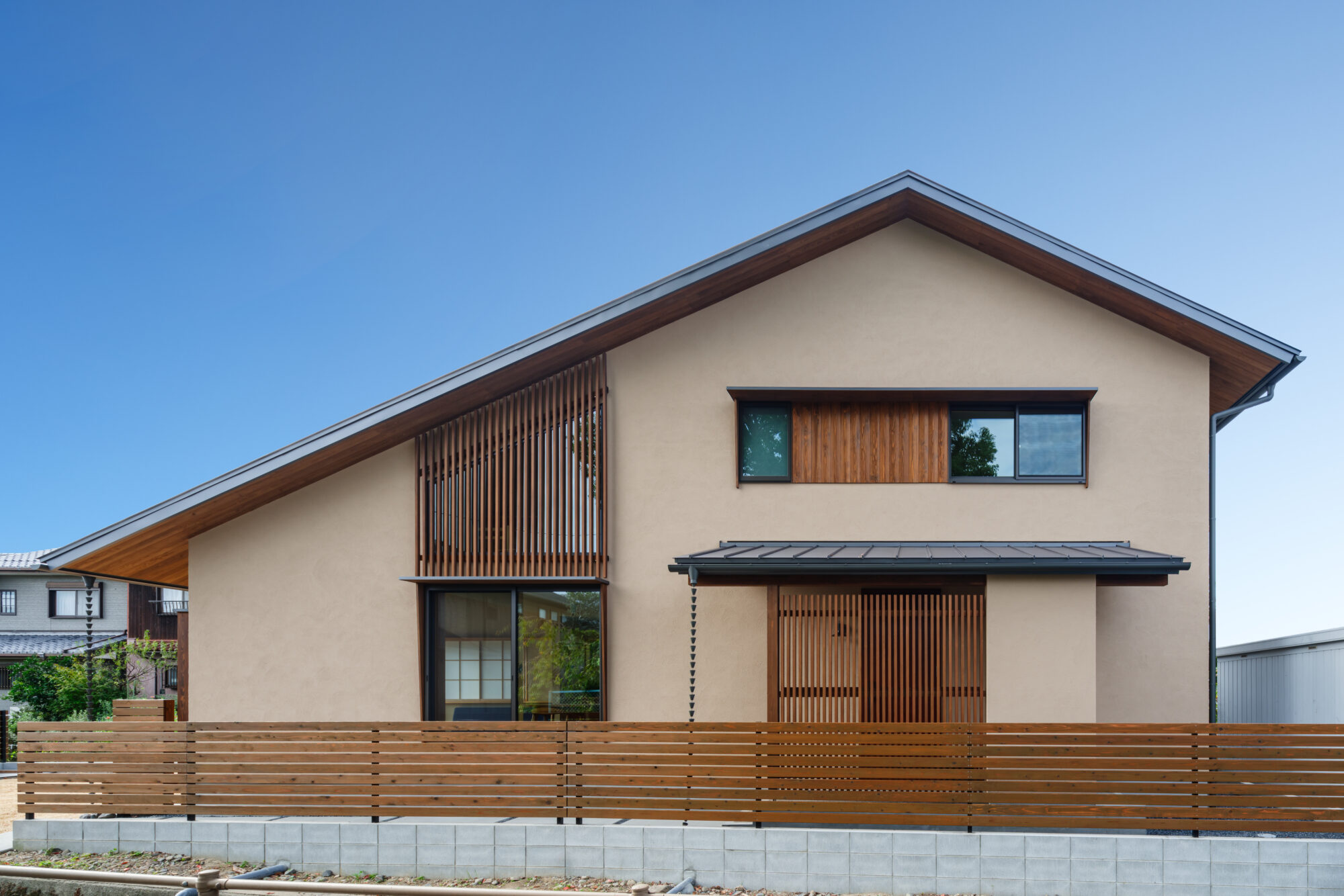 外部は左官壁と木格子を組み合わせ、周囲の街並みとの調和と視線制御を両立。アプローチには軒の深さと素材の切り替えによる「間」を設け、外から内へと意識が緩やかに切り替わる構成としています。敷地特性と暮らしの在り方を丁寧に読み取り、経験と設計力が求められる計画としました。