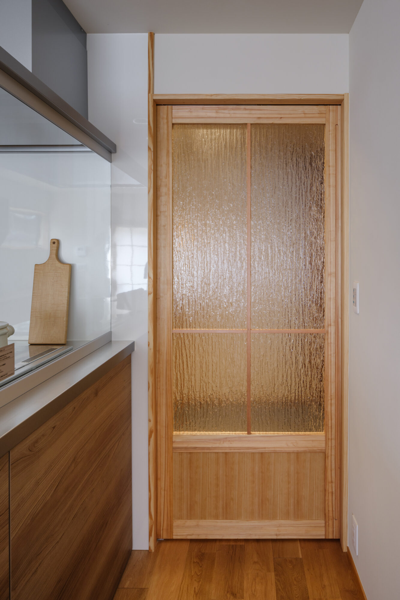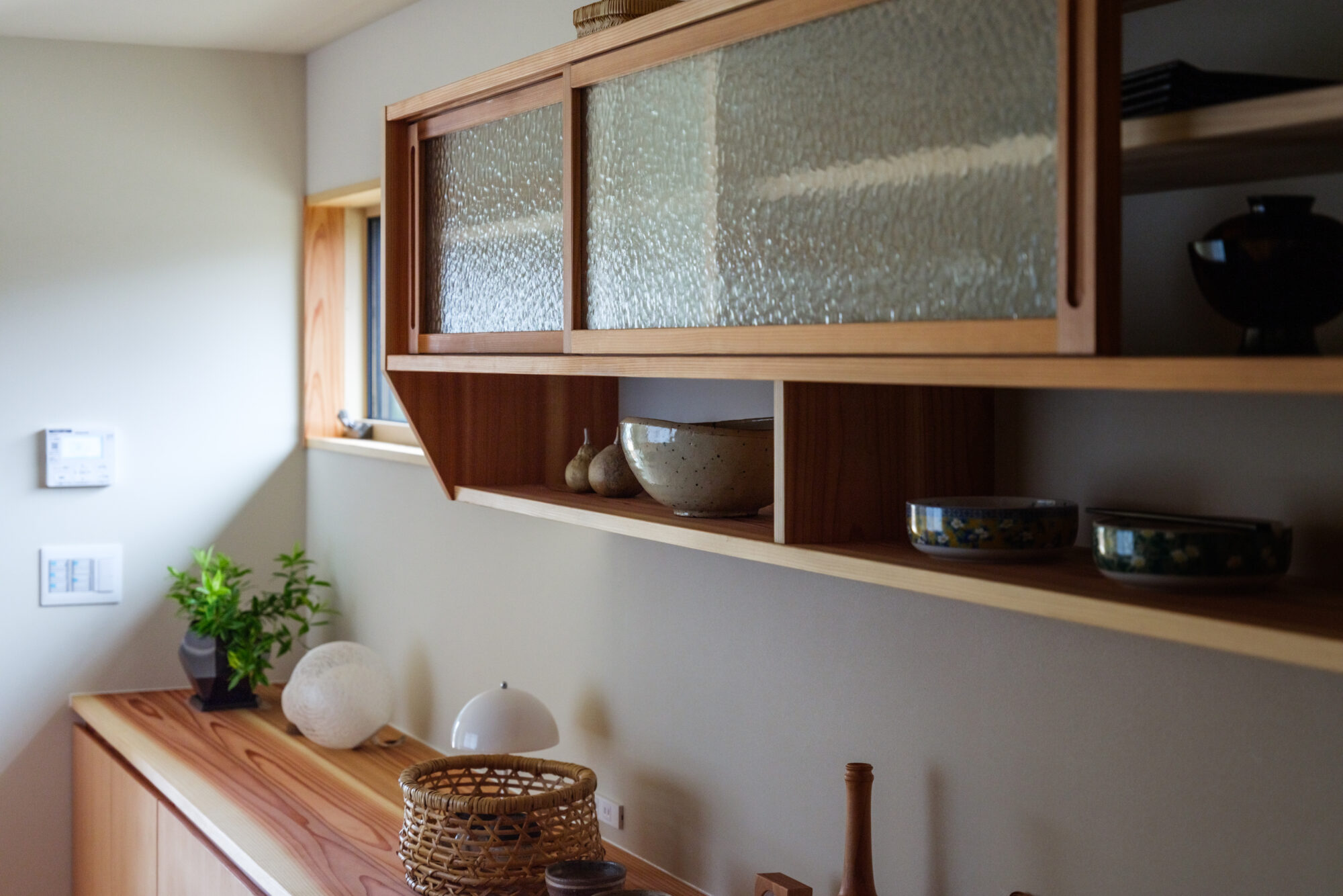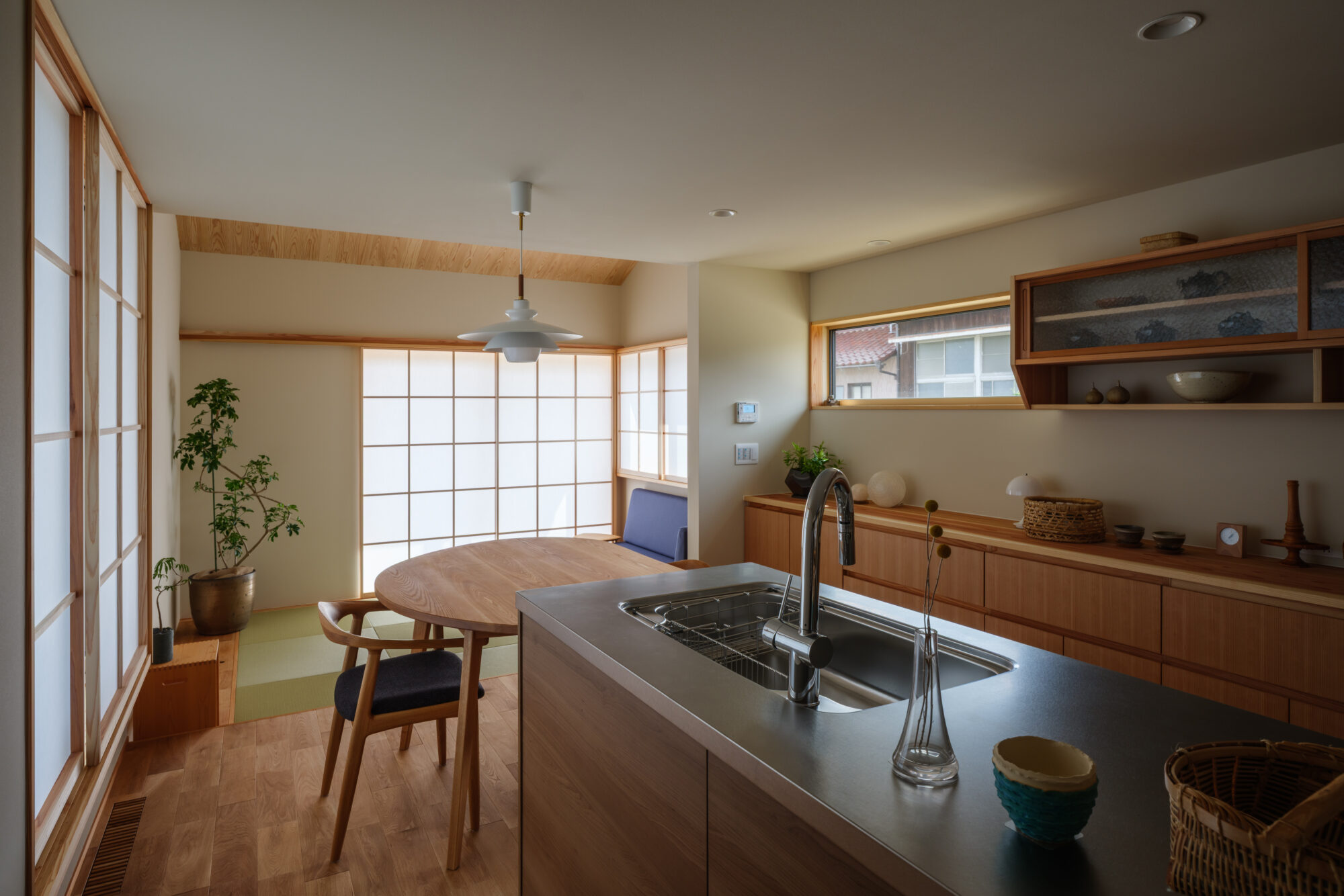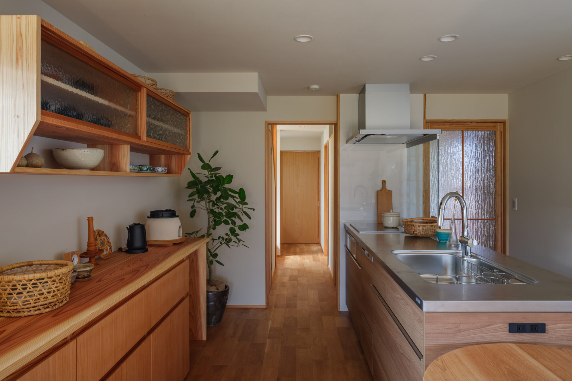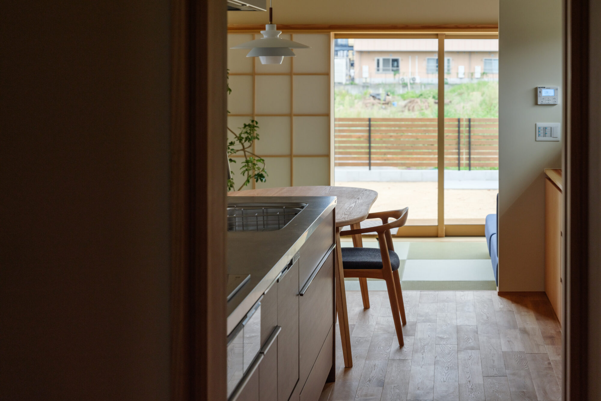 毎日立つキッチンだからこそ、既製品ではなく、手に触れる質感や佇まいまで丁寧に整えました。天板の高さ、引き出しの場所、造作建具越しに差し込むやわらかな光。料理をしながら、畳リビングで過ごす家族の気配を感じられる距離感も大切にしています。器や道具が自然と馴染む造作収納は、暮らしの積み重ねを受け止める場所。家事の時間が作業ではなく、静かに心が整うひとときになるよう、想いを重ねた空間です。