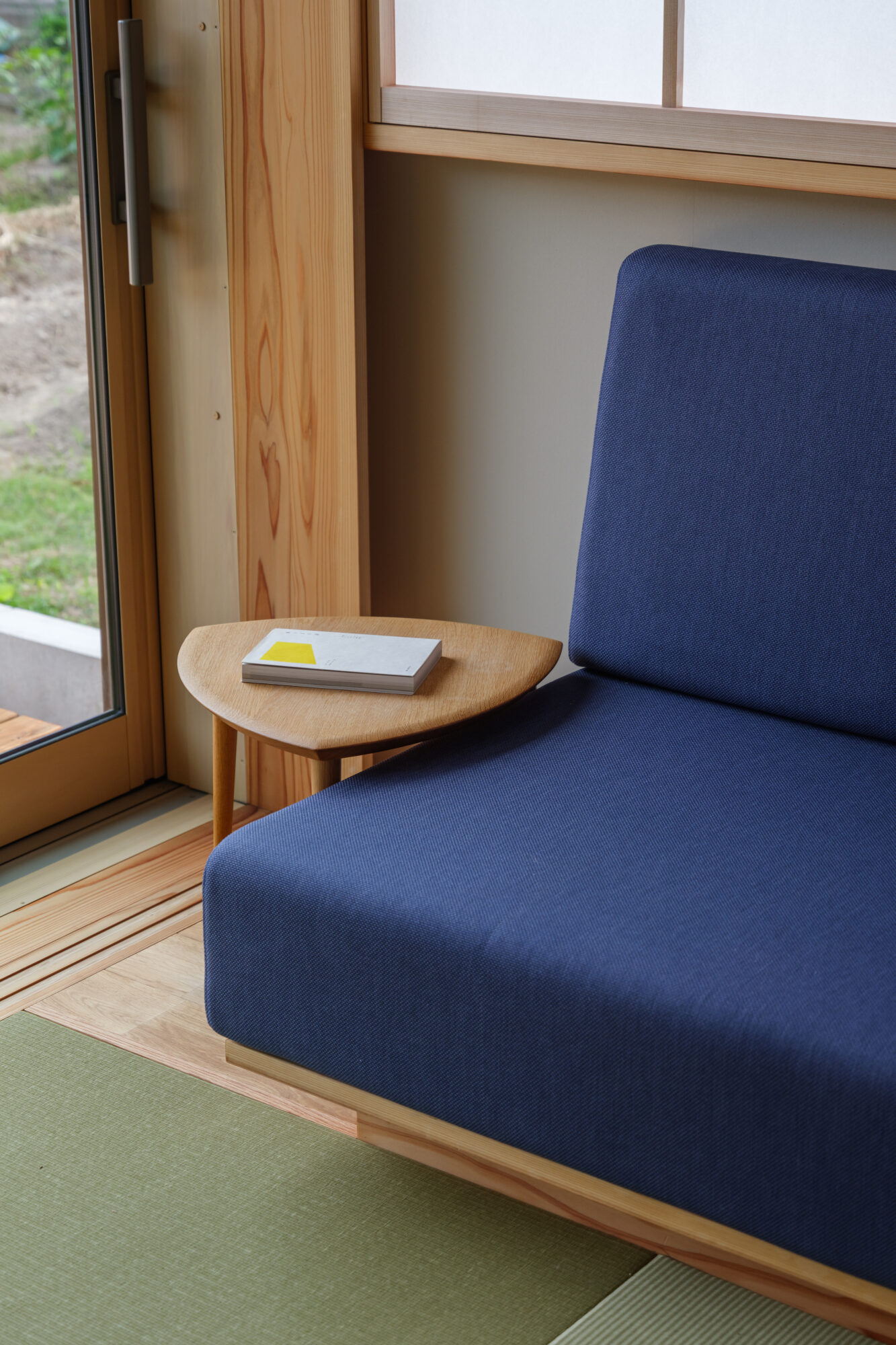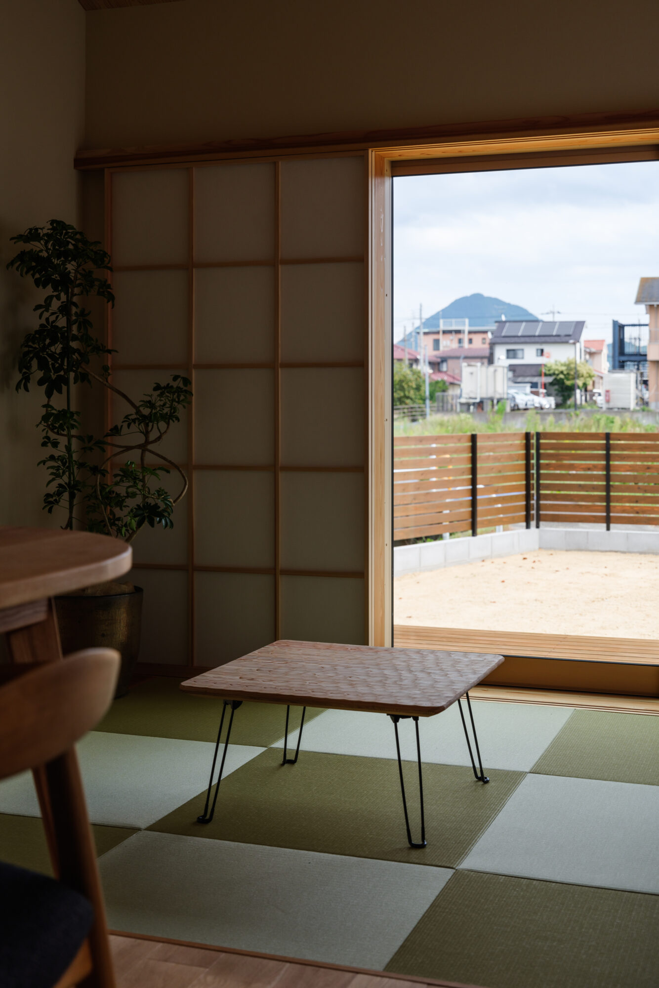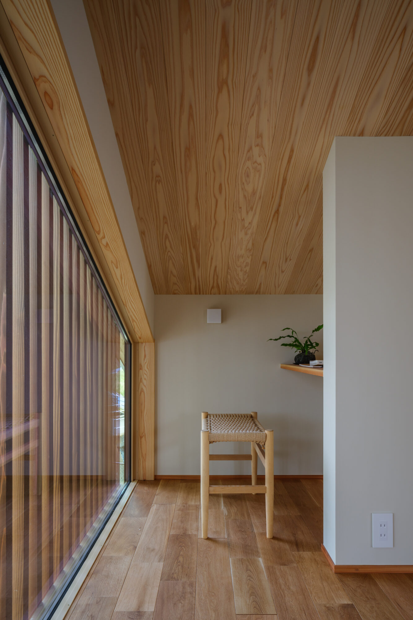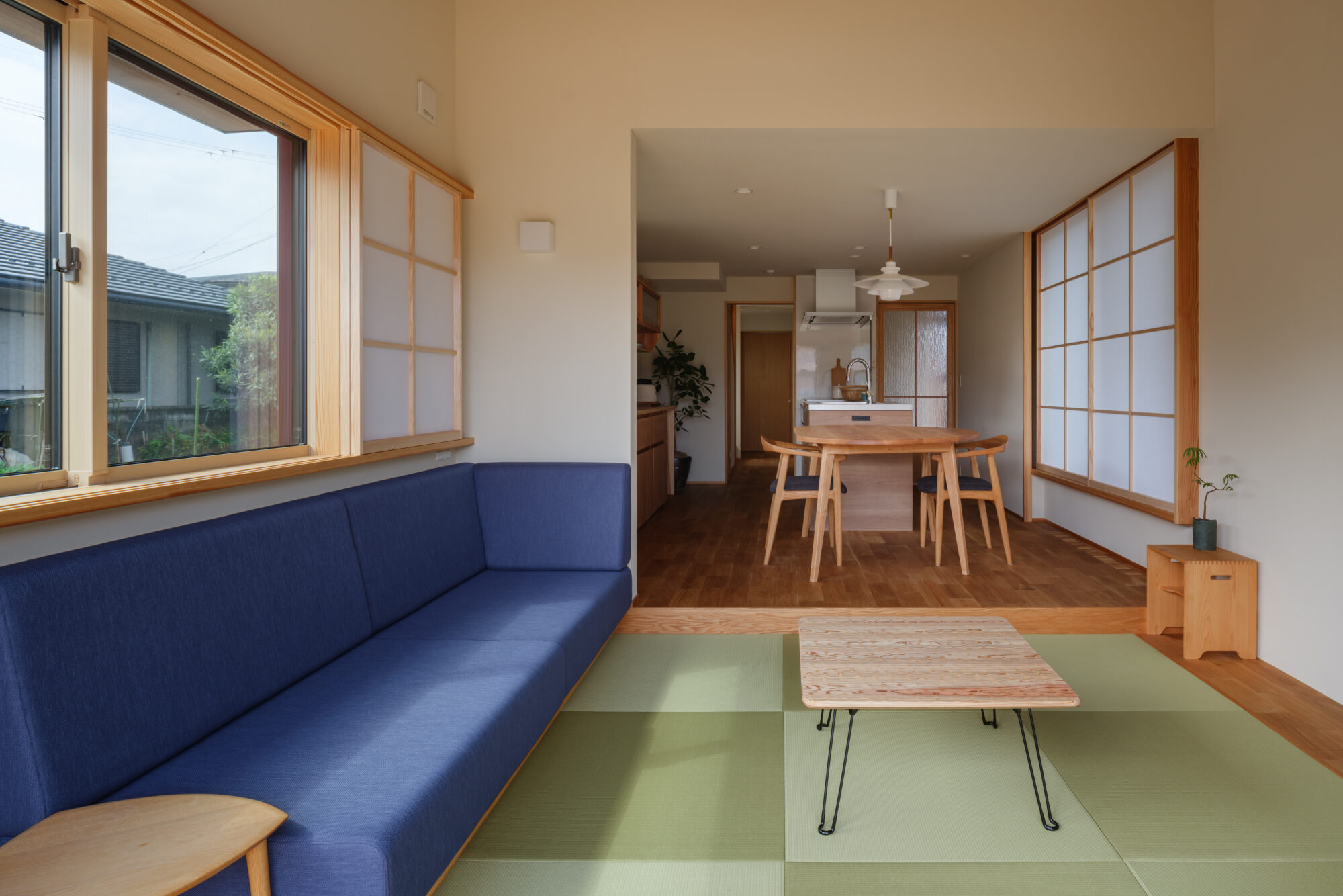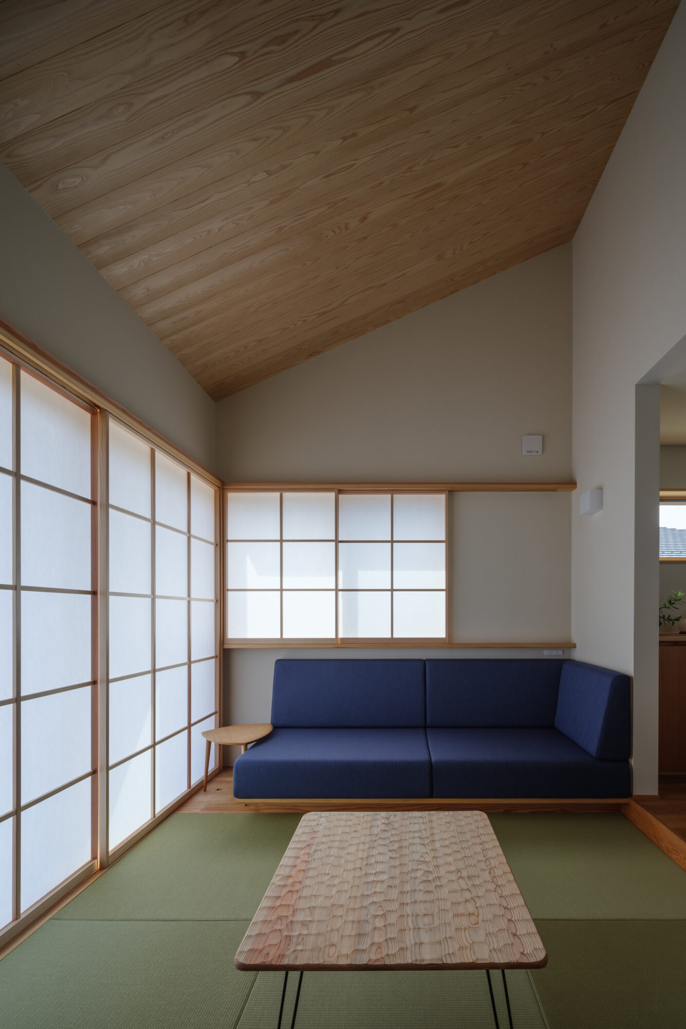 住まいの中心に畳リビングを据え、床座の視点から空間を再構成しました。勾配天井の羽目板材が大屋根を連想させて室内の空間にゆとりをもたせ、障子を通した採光が均質な明るさをもたらします。造作ソファや低い家具により視線を抑え、家族が自然と集うための居場所を成立させています。