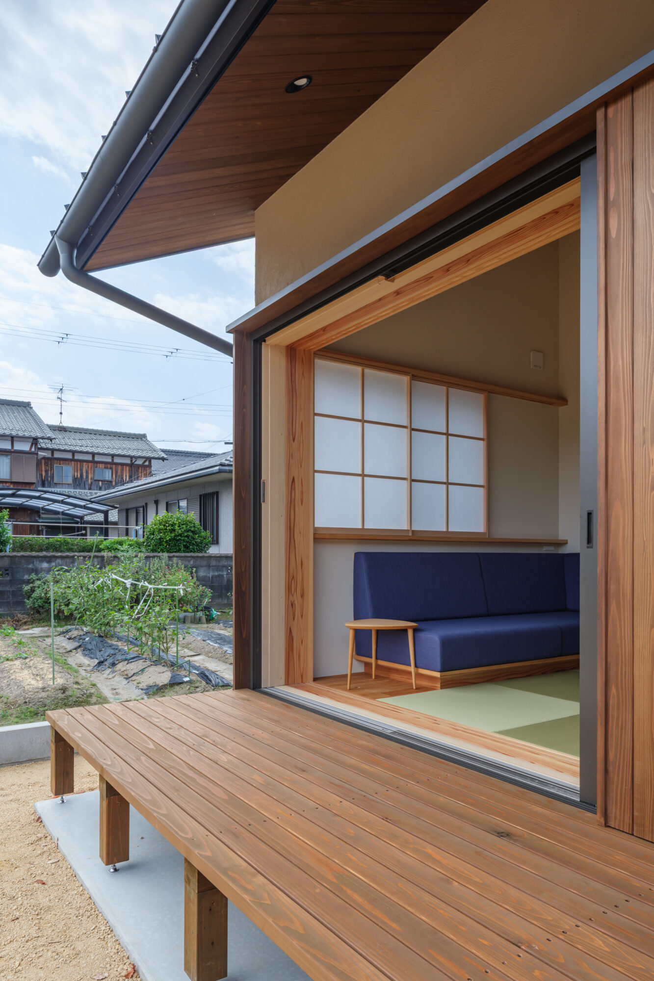 深く張り出した軒の下、縁側に腰掛けて季節の移ろいを眺める時間。自然にものに触れるたびにやさしい温もりを伝え、暮らしの輪郭を静かに整えてくれます。建具に選んだガラスから差し込む光、外灯の柔らかな陰影、木目を生かした家具の表情。そのひとつひとつに理由があり、夫婦が好きな素材を選び重ねた先に、家族の何気ない日常が育まれていきます。住まいは完成した瞬間から、ゆっくりと「暮らし」へと変わっていく。その過程を大切にした一邸です。