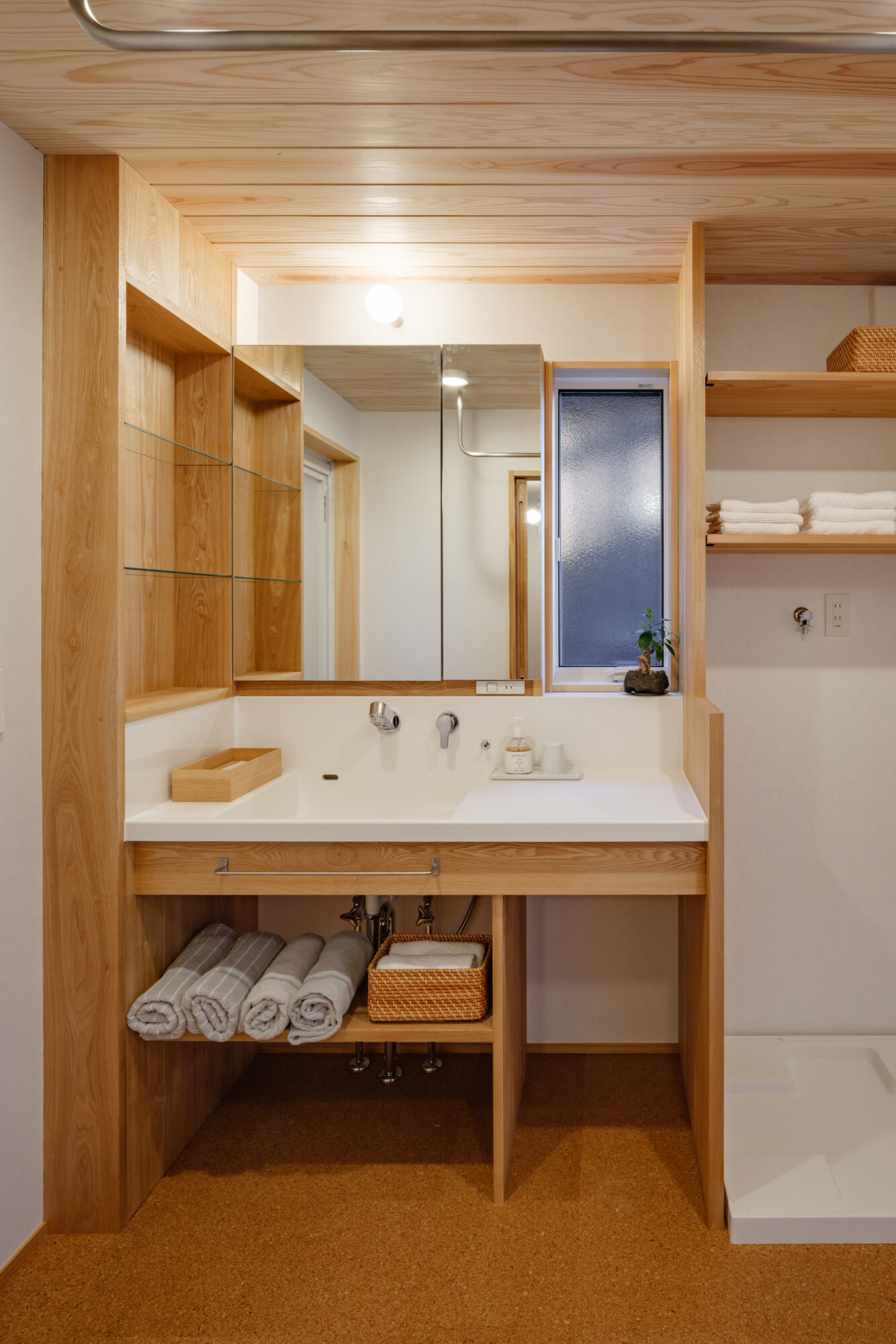 水まわりへと続くと、丁寧につくられた造作洗面。