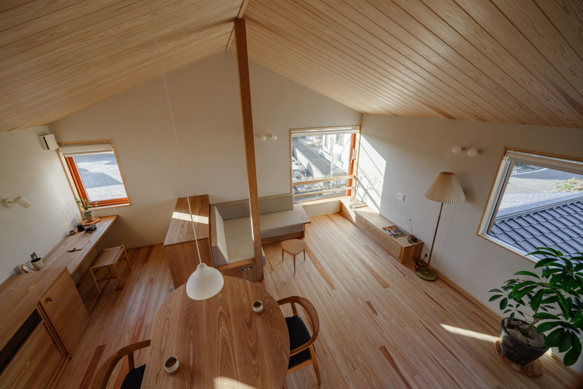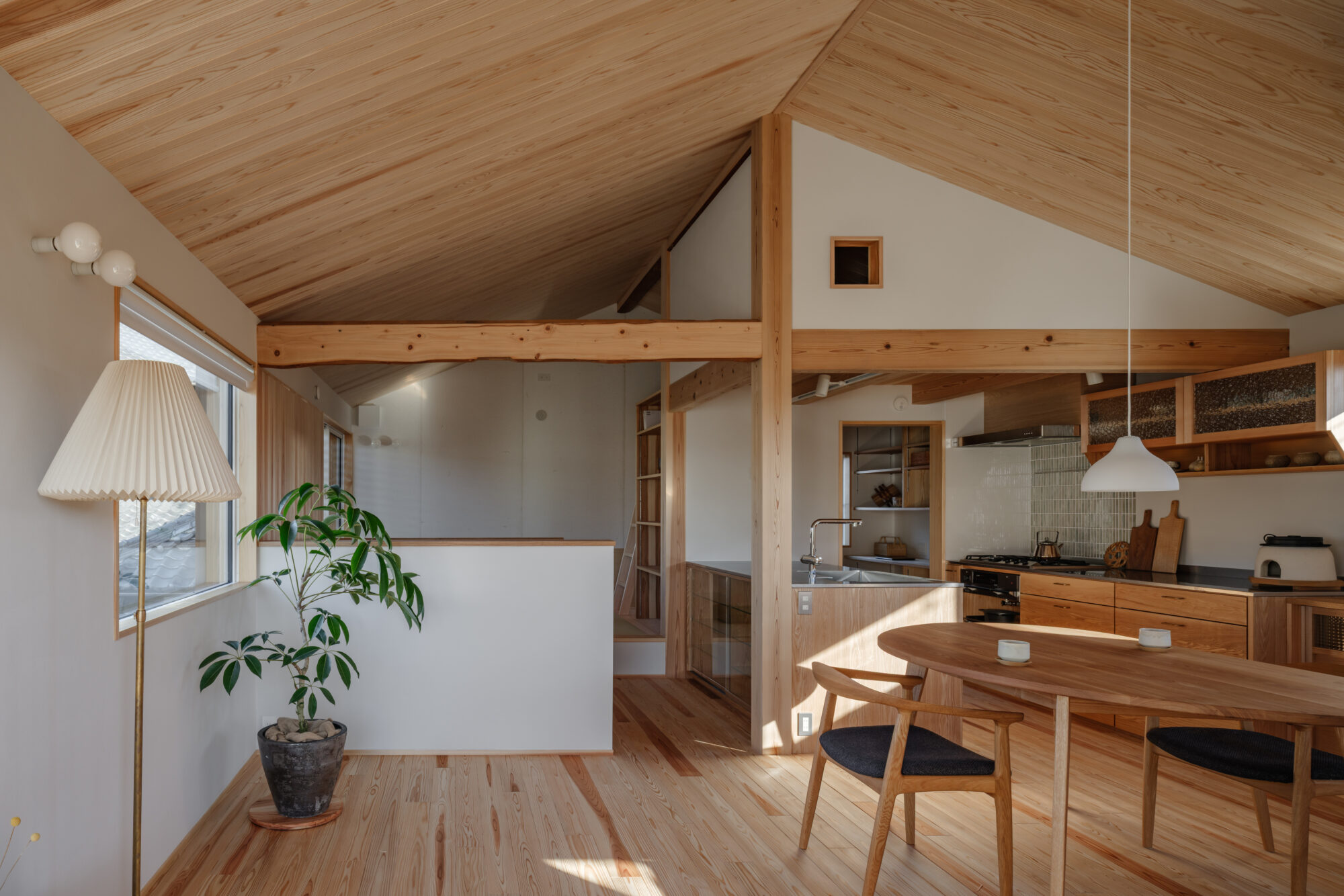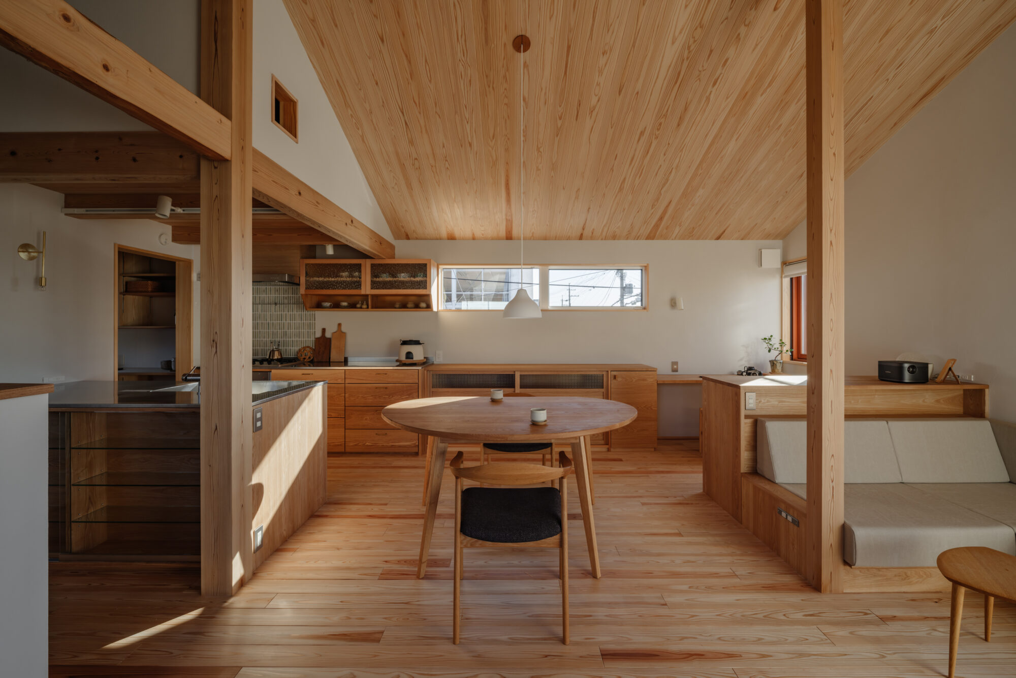 杉板の勾配天井がやさしく包み込み、空気まで軽やかに感じられます。