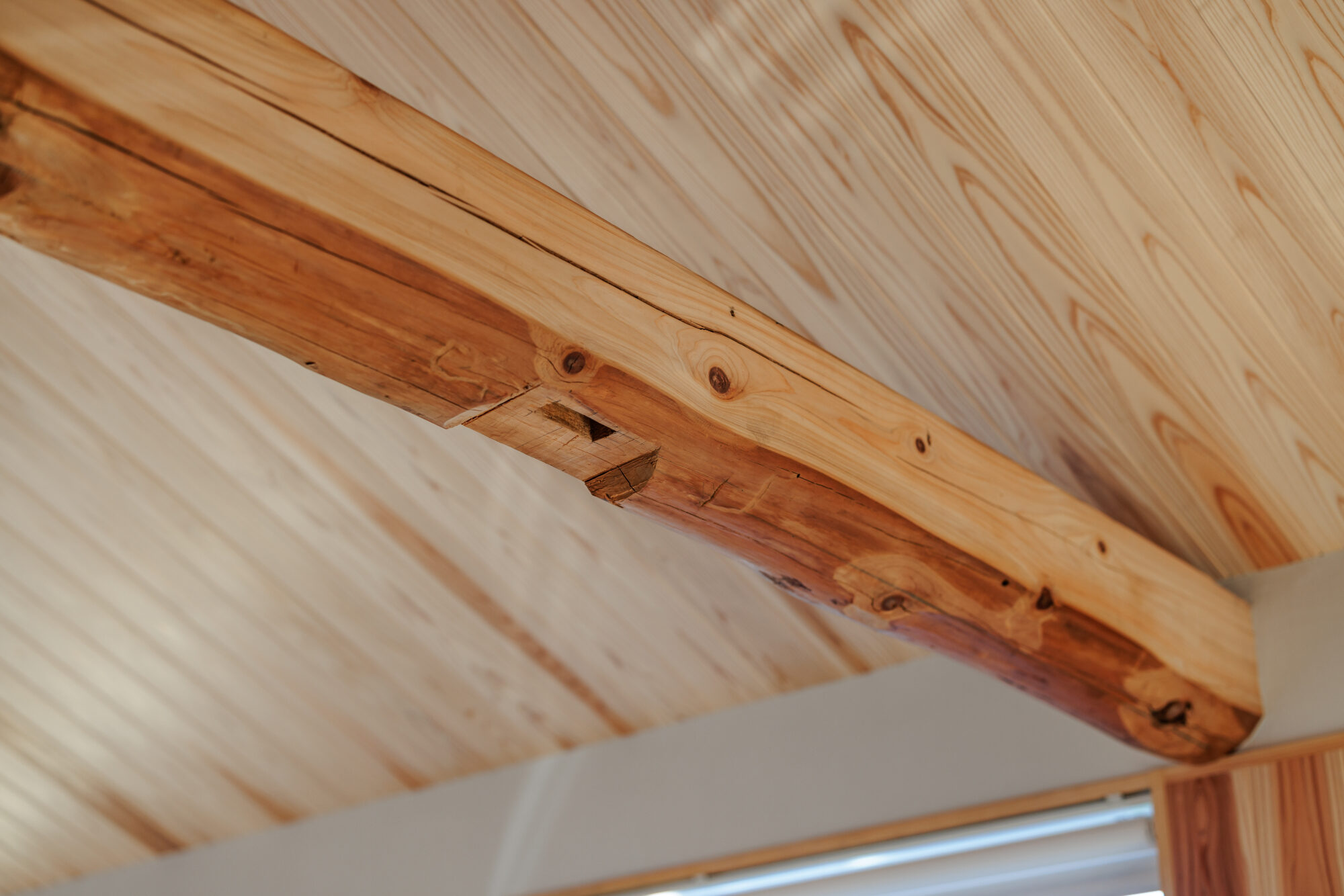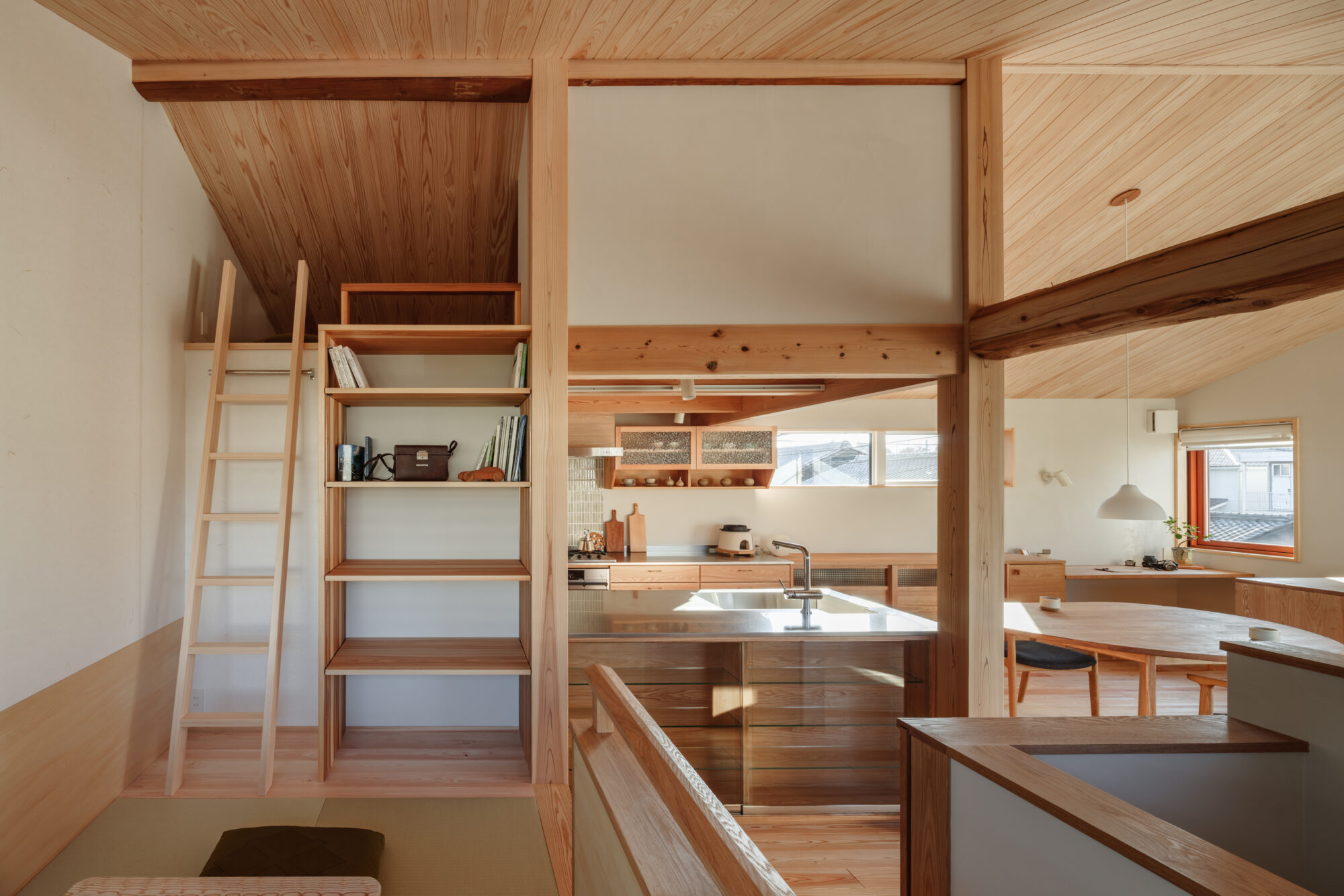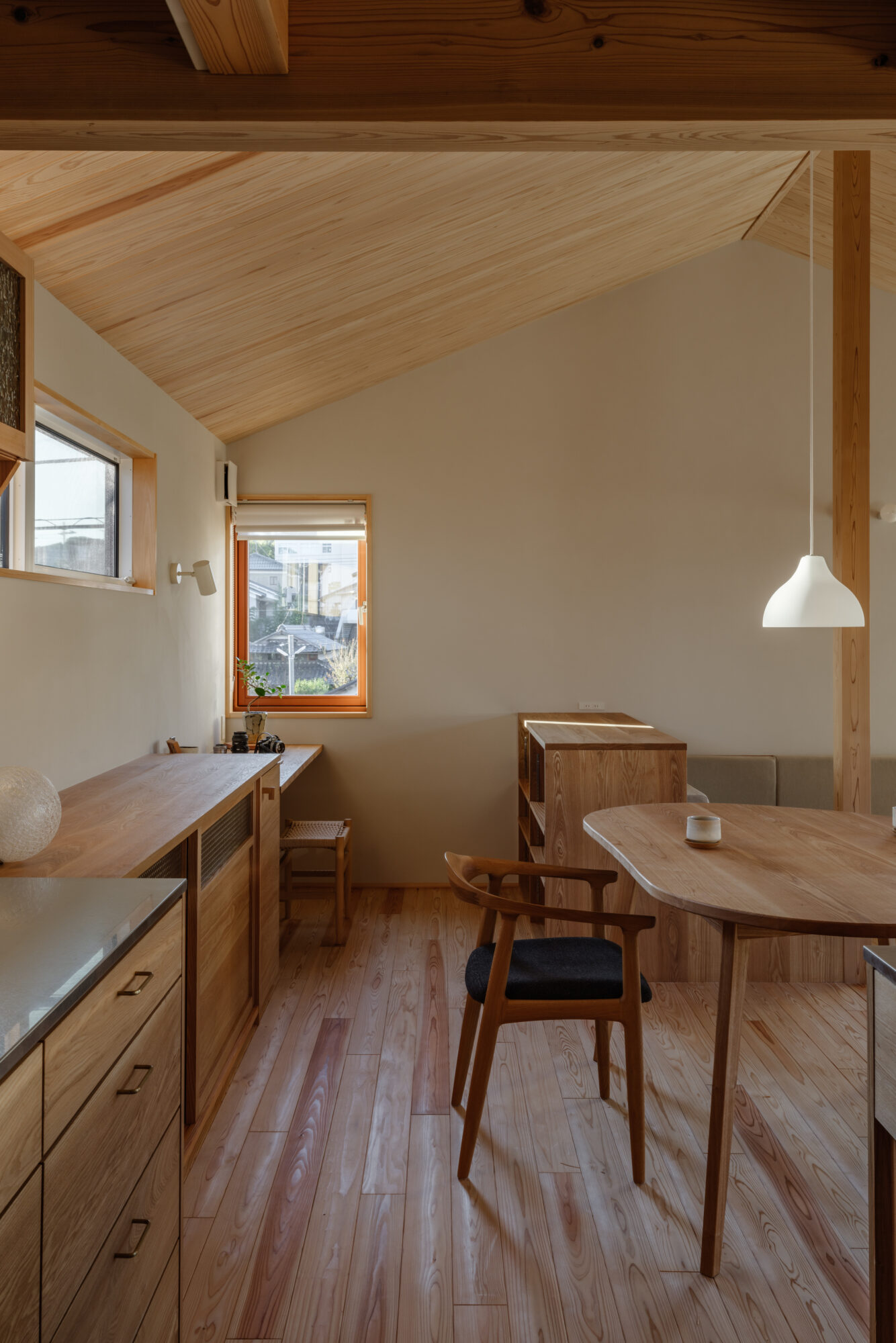 杉板の勾配天井がやさしく包み込み、空気まで軽やかに感じられます。