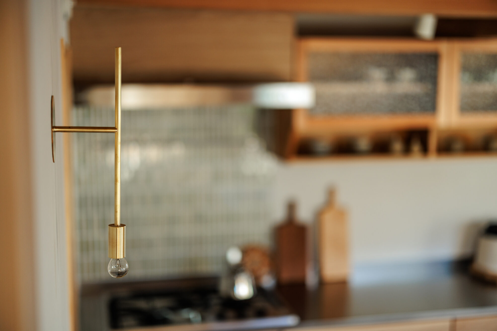 壁に添えられた真鍮のブラケット照明は、スムースらしいやわらかな光で、帰宅のひとときをやさしく包み込む。
